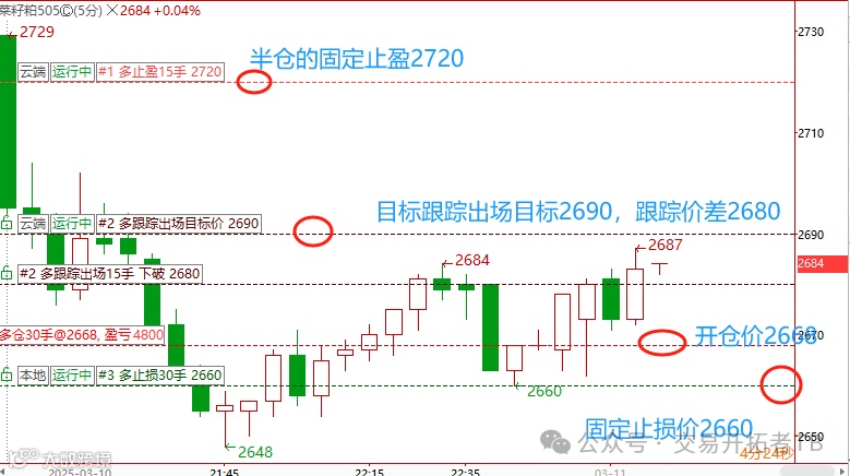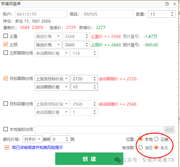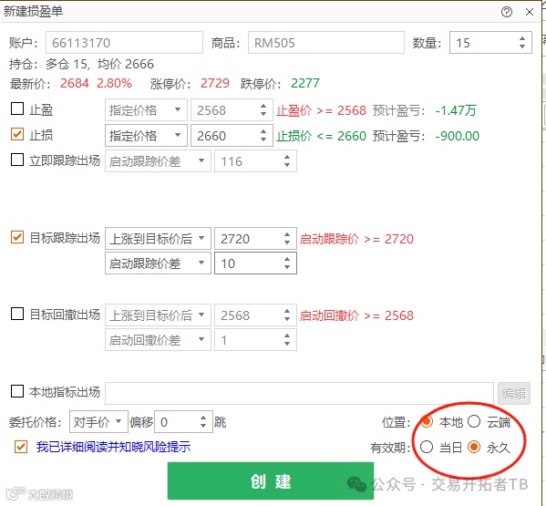 止盈我分了2个策略,一个策略是固定止盈2720,这里设置15手,另外15手就设置了要给目标跟踪出场,目标设置2690,跟踪价差为10。如下图,可以直接画线来实现止盈止损,也可以像上面一样把页面打开填数字。