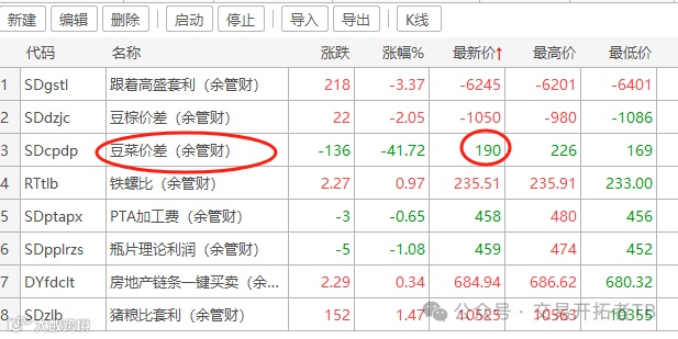 昨天我写菜粕文章提到,如果豆粕能也顺着涨上来,菜粕上方的空间会很大。但是豆粕大跌,豆粕和菜粕的价差就剩190块了。很大程度上制约了菜粕的涨幅。这让我心里感觉是菜粕的空头打了一场“围魏救赵”,因为豆粕打下来容易,菜粕的大利好刚来,如果逆势加空绝对被人干爆。