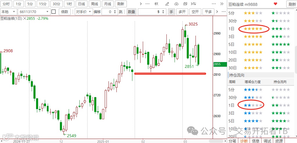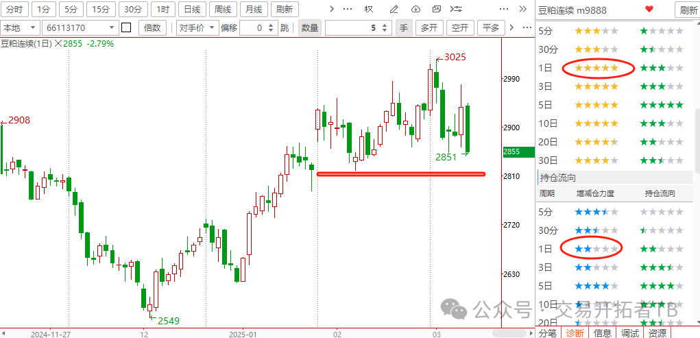 由下图可以看到,今天很明显的一个阴包阳形态,这是非常强的看空技术形态了。原本昨天那根阳线也是菜粕影响拉上去的,因为关税政策没有涉及豆粕,所以你把昨天那根“情绪阳线”去掉,你就会发现,往下跌才是近期的正确趋势。