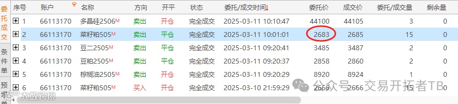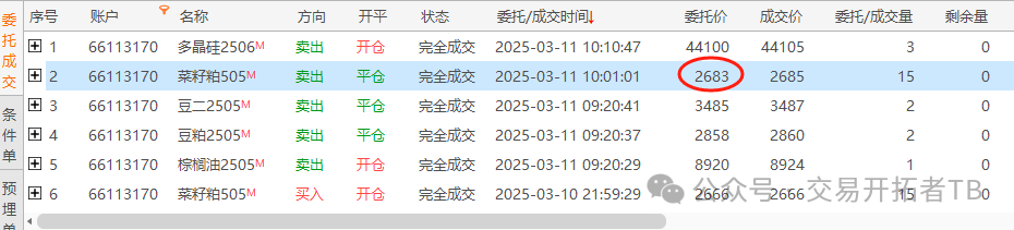 最后就真的回调到2683了,触发系统委托,实际平仓成交价是2685。这15手的交易就完成了。