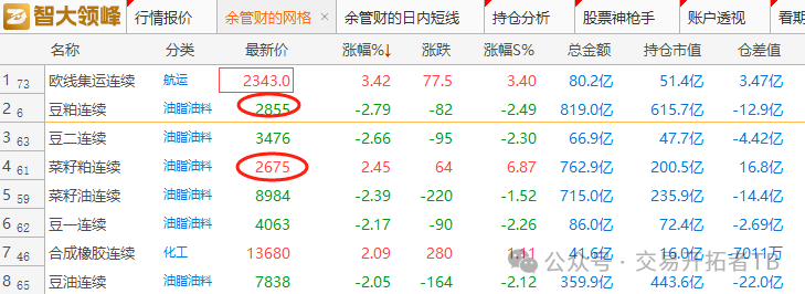 很多机构都会在豆粕,菜粕,豆油,菜油和棕榈油这几个品种里做套利,它们的套利模型各不一样,所以要对冲昨天那样的风险,聪明的资金肯定不会逆着大势加仓菜粕空,而是在豆粕和菜油上动手。