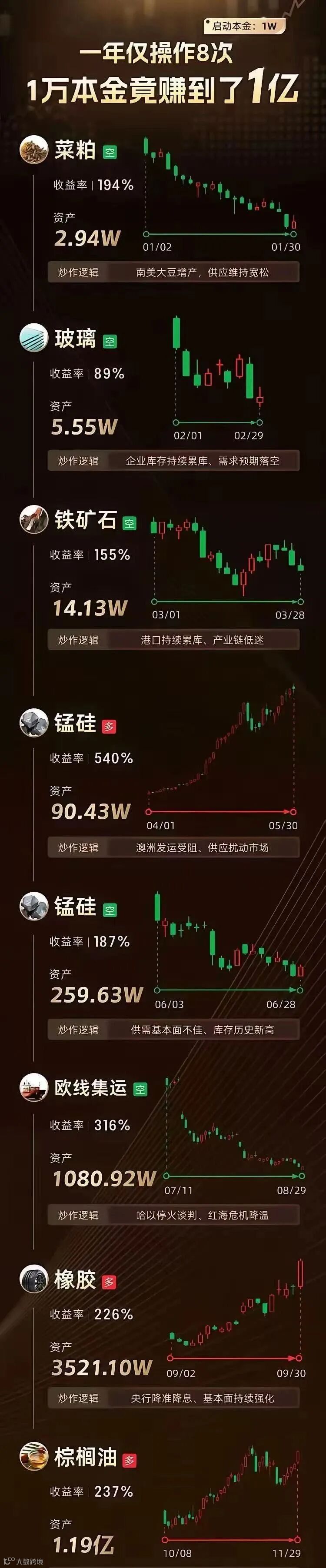2024年的期货市场很不平静,昨天有朋友在群里发了一张如何在期货市场赚到1个亿的图,很有意思。我把图放在文末了。今年是个商品大年,潮起潮落,有人爆赚走上神坛,有人亏的心灰意冷。但是这都将成为过去,2025年正向我们走来,2025年的机会面前,人人平等!
