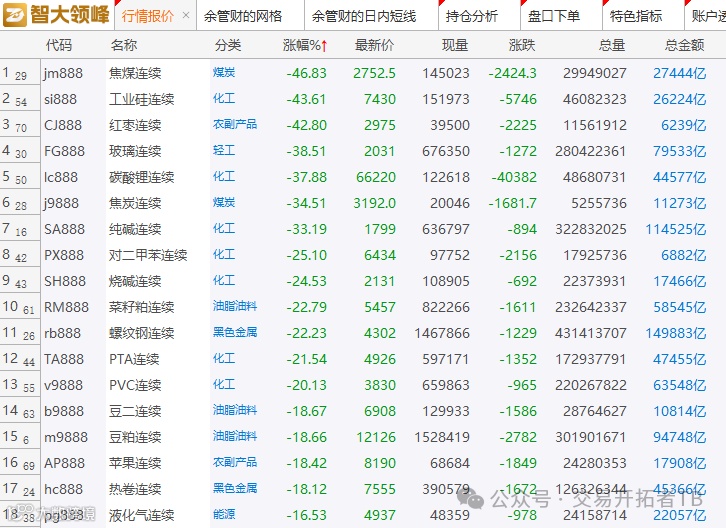期货主力连续合约跌幅榜如下,焦煤大跌46%,工业硅大跌43%,红枣大跌42%,玻璃大跌38%,碳酸锂大跌37.88%,焦炭大跌34.51%,纯碱大跌33%。