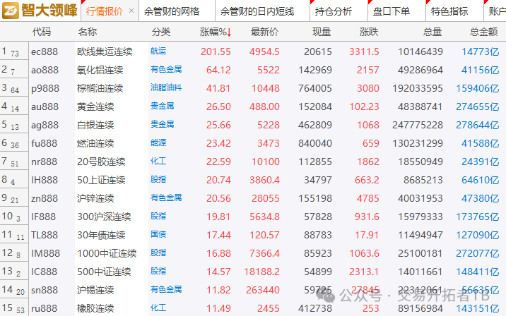 用智大领峰做一个阶段统计,从1月1日到今天,期货主力合约涨幅榜如下图,欧线今年暴涨2倍,氧化铝大涨65%,棕榈油暴涨42%,黄金涨26%,白银涨25%等。