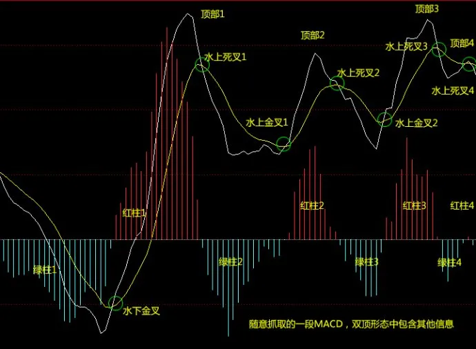 那什么时候应该卖出呢?接触过形态学的人应该会去选择双顶的位置,也就是顶部3的位置。不过在那个时刻,后面的图形还没发生,双顶形态还不是很明显,顶部3的位置只是理论卖点,或者是保守者提前的卖点(减仓),一般很少人去卖;那个位置股价应该还是在涨,散户依旧持股的可能性比较大。最可能的实战卖点在水上死叉3,那个时候双顶形态非常明显,MACD又出现死叉。