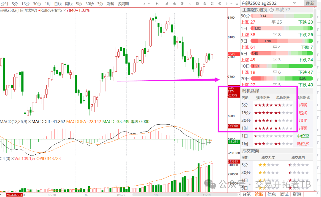 日线的时机选择显示的暂无趋势,但有不少朋友就是要找那种顺大、逆中、顺小的位置来试错,但当前白银在时机选择上基本就是这个样子了, 其周线时机选择的趋势还在, 当然,这波回调下来没那么强了。日线时机选择无趋势, 但低级别所有周期的时机选择形成了“4星2星”共振。那今日我们就入池验证下,这种顺大、逆中、顺小的方式合不合适吧。
