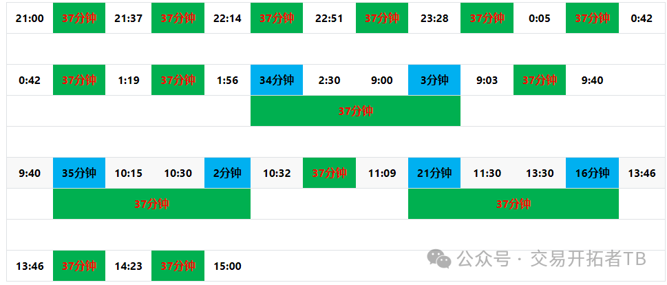 连续时间等距方式,从每天交易开始时间开始分割,按照时间周期的间隔,进行等距切分。我们还是以前面的白银37分钟为例,从夜盘21点开始,按照连续时间等距,切分结果如下图所示(灰色表示整个K线非交易时间,不产生K线):