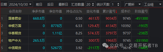 目前工业硅净多头前几名分别是,方正中期,国贸,金瑞,南华,安粮,等。净空头前几名分别是国泰君安,永安期货,一德期货,物产中大,海证等。