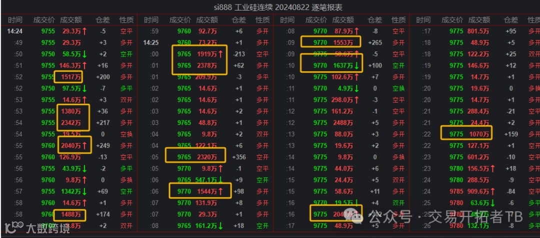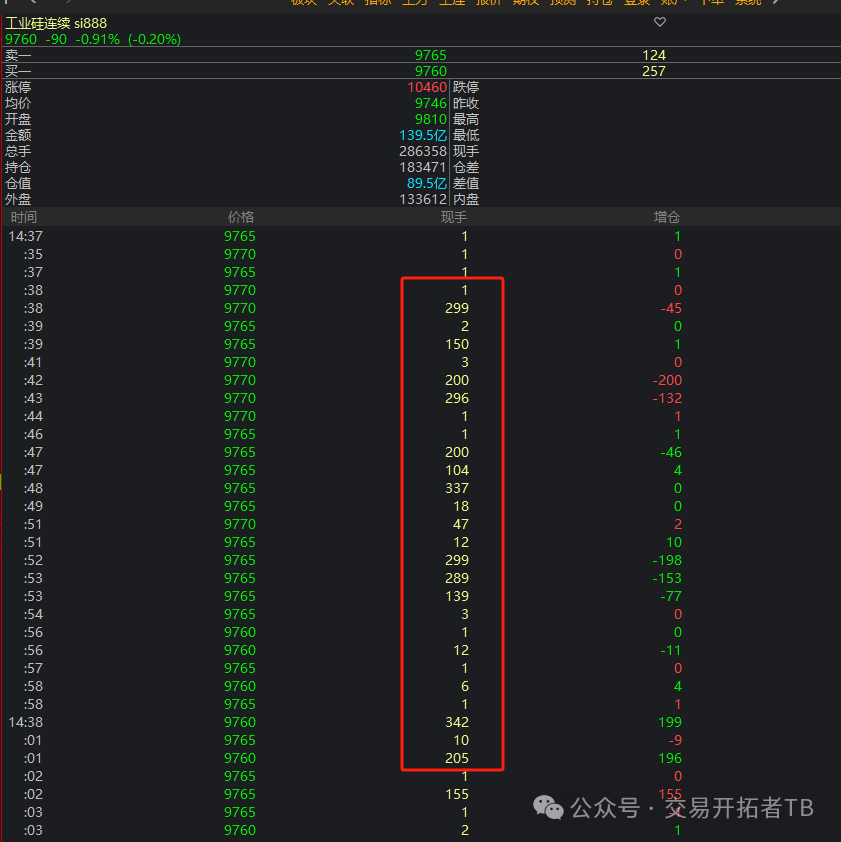 今天盘中,工业硅出现一个非常有趣的现象,有大佬在同一价位“PK”,关注了工业硅的朋友就能发现,下午14:23的时候成交量突然大涨,我看交易明细发现,是有2个大户在“互殴”。短短15分钟,大户砸出数千万资金。