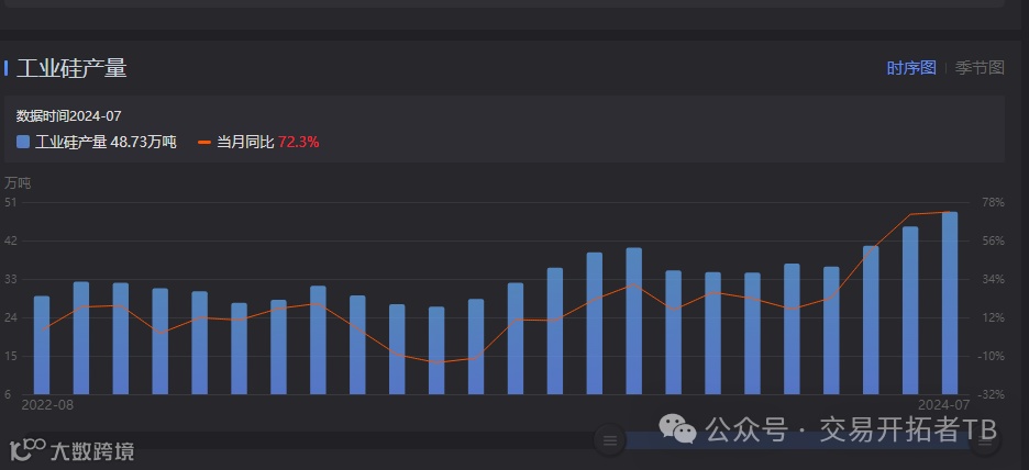 虽然需求疲弱,但是因为前几面上了很多项目,现在很多产能开始释放,所以,尽管价格不是很美丽,但是各大公司该上的产能是一点也没有减少。工业硅产量如下图,7月份同比增加72%。