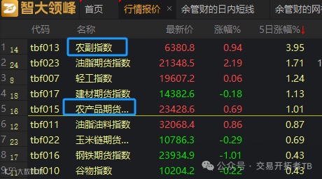 一周又过去了,本周涨的最好的是农副指数,这个指数里只有红枣,苹果,生猪和鸡蛋。下面还有一个叫农产品指数的,里面就把菜籽油,菜籽粕,大豆,白糖,棉花等产品都囊括了。