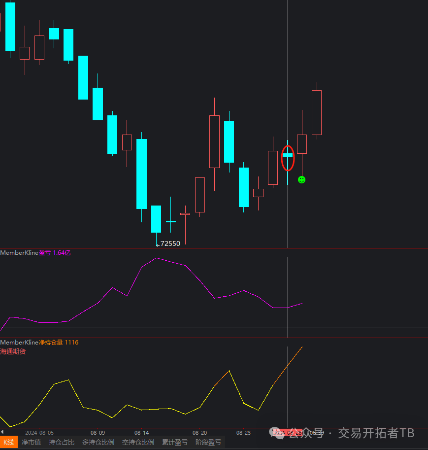再看【管财指标】,这个指标是通过2根K线找趋势的逻辑写的。这个指标最近一次多单买入点是前天,昨天和今天都是收阳线,用2K线的逻辑去做的话,那么现在可以设好保本,跟踪趋势了。具体的用法参考我这篇文章《方法论 | 趋势交易法之第二根K线策略》