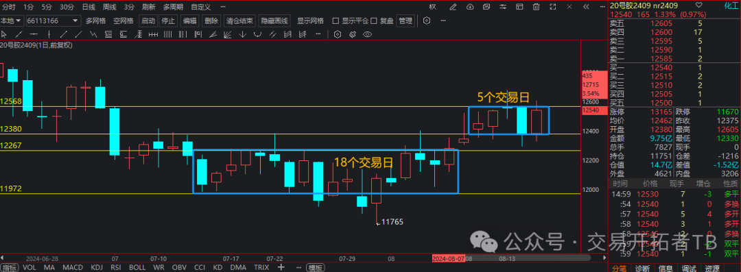 第二震荡区间:再看近几个交易日,20号胶波动区间是12380-12568,价差188块,做10块钱的格子就需要布20个格子,才能做到这个区间的震荡。
