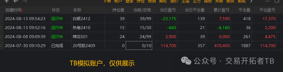 来举个例子,下图是我专门测试网格交易的模拟账户,做了四个品种,分别是白银,热卷,棉花和20号胶。
