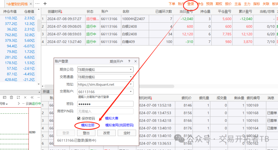 点击右上角【下单】弹出的下单板后,可以直接进行模拟账户交易,值得注意的是,如果同时登陆了实盘和模拟盘,注意在第一下单前检查一下是勾选了多账户同时下单还是但账户。如下图
