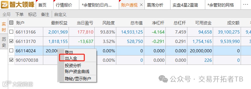 在账户透视页面,鼠标选中该账户,鼠标右键,就可以看到出入金的功能,进去则可以调整资金规模。
