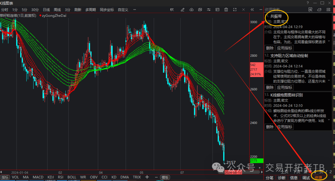 做长周期的朋友可以在K线上加载一个共振带指标,像下图,价格沿着红线下跌,开仓点基本上都是红线位置,绿线位置做止损。