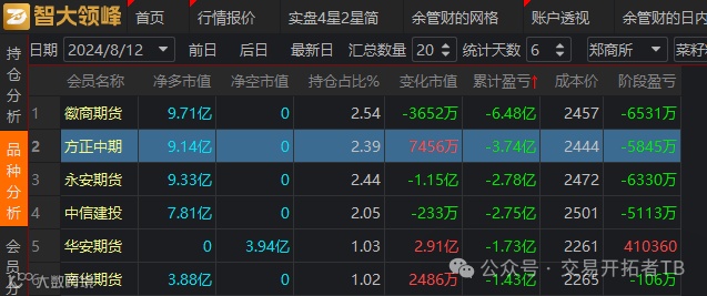 整体来看,目前菜籽粕最大的净空头是乾坤期货,老二是摩根大通,老三是中粮。大空头这个阵容,做多的真是天不怕地不怕呀。可以看到,乾坤一个星期赚2亿,摩根一个星期赚1.26亿。期货市场对他们来说,简直是取款机呀。