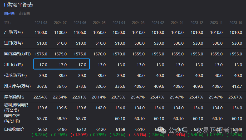 认真研究一下白糖供需数据,产量每个月产量都在1000-1100万吨,进口量每个月也差不多,消费量每个月在1570万吨左右。出口的增加可以忽略,主要库存量目前占消费比是22%。