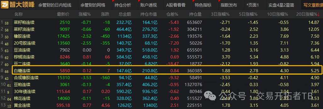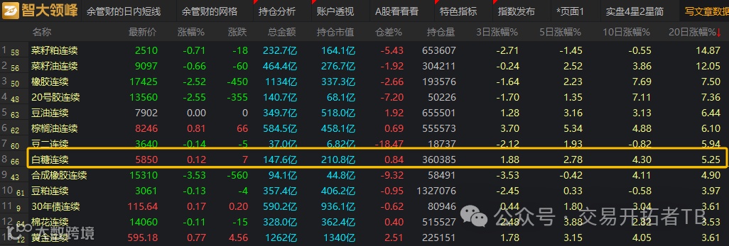 选趋势品种有一个小技巧,就是看10日涨幅和20日涨幅。看这么长周期能够避开一些无效信号。比较适合做右侧的趋势交易者,如下图,可以看到近期多头趋势有过行情的是菜籽粕,菜籽油,橡胶等,白糖也不错,已经从底部偷偷的涨了5%了。刚好是右侧交易者可以关注的时候,我们一起来瞧瞧!