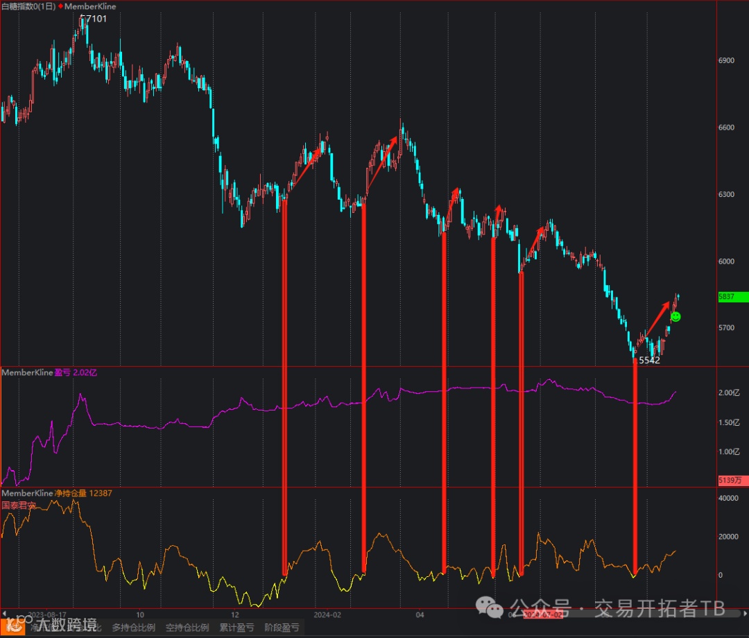 国泰君安目前持有1.23万手净多单,从他持仓对比行情来看,可以发现每一次反弹都是他买起来的。如下图可以看到,它每次空翻多的时候,多单大笔加仓的时候,白糖都有或大或小的反弹。后期需要持续关注这个席位加减仓情况。