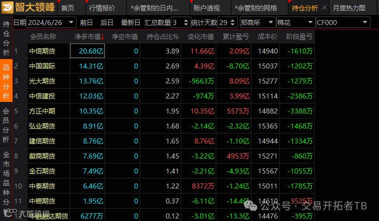 目前棉花最大的多头是中信,老二是中国国际期货,老三光大,老四中信建投。空头前五的分别是银河、国泰君安、国投安信、国联、国贸。