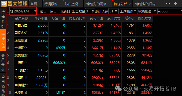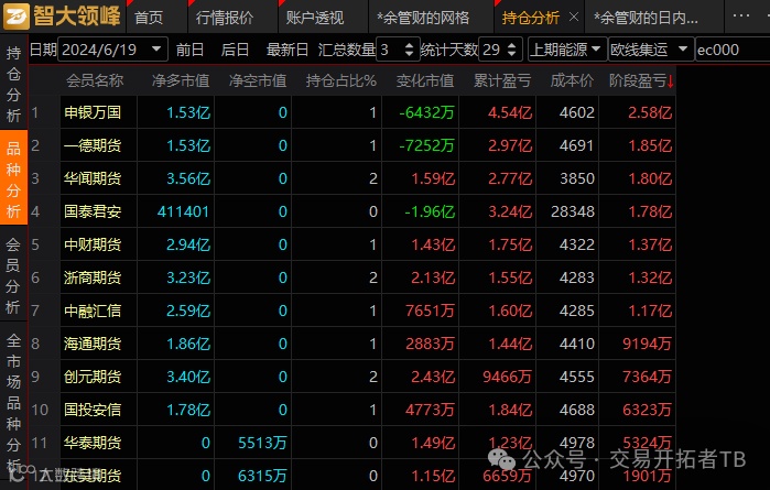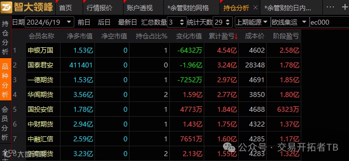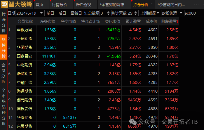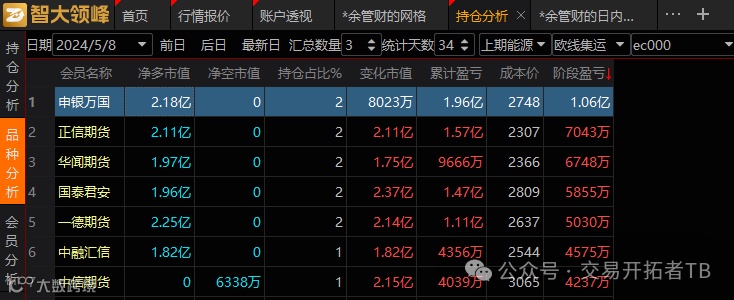 从欧线期货上市以来总的盈亏来看,申万豪赚4.5亿排第一,申万这个席位上做欧线的,看持仓风格应该是个机构,这个机构的操盘手真是可以封神了。可以关注下这个席位在其它品种上的操作。