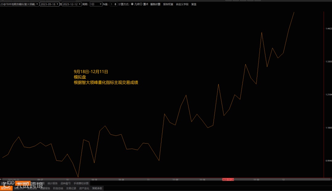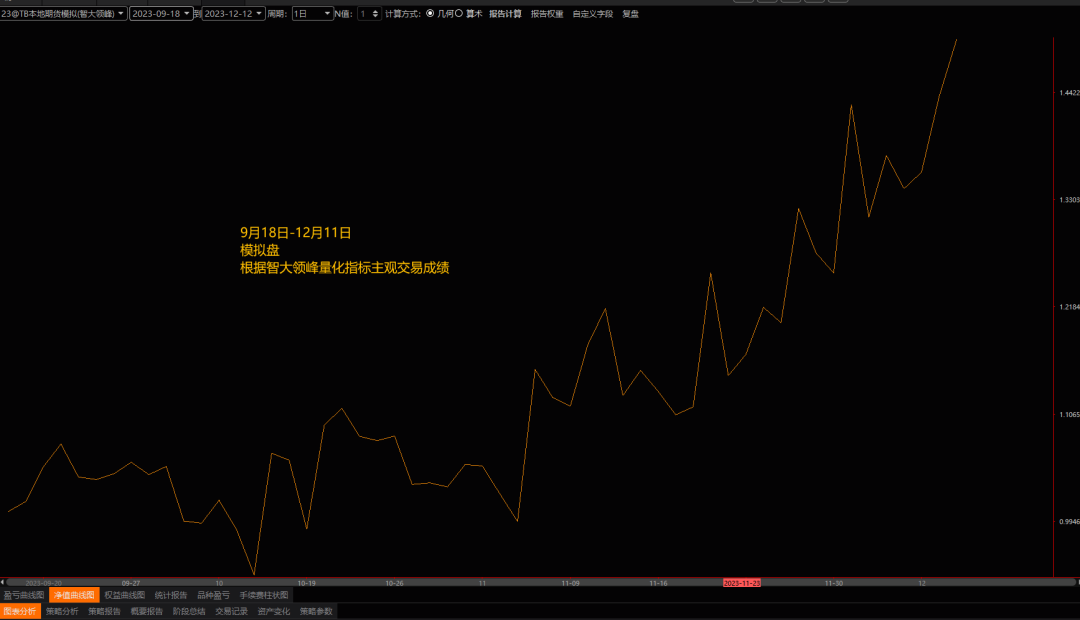 大概就是这些吧,如果以后我有新想法我再来补充吧。智大领峰 趋势强度指标是9月份推出来的,我用模拟盘跟踪这个指标做趋势,目前浮盈50%左右,净值曲线如下图。顺便说一下,我选品种就完全是根据 智大领峰 趋势强度4星及以上,风险2星及以下的。