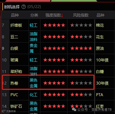 1、热卷是多头趋势强度5颗星,风险指数1颗星。这就是一个很好的趋势信号,我会把这个品种纳入自选,盘中找机会介入。