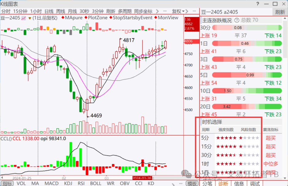 节后第一天,大家都在消化过节期间的动能,虽然今天满足增仓(黄色,增减仓力度指数黄色星星多)、放量(面积大,成交量力度指数星星多)的品种比较多,看了看,满足时机选择多周期“4星以上、2星以下”共振的品种,只有豆一,哈,如图