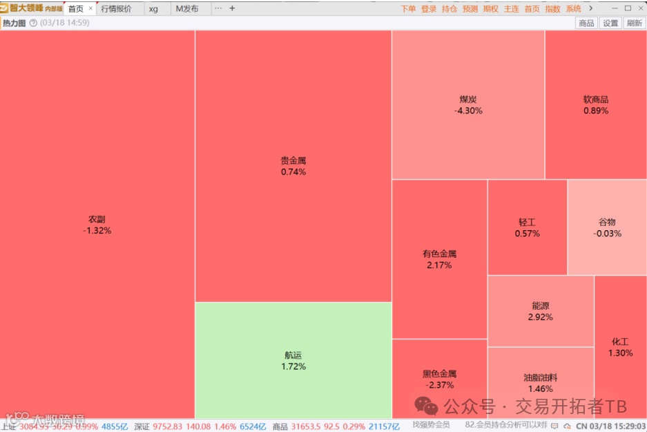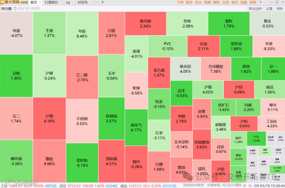今日份的期货市场快速复盘开始。还是从整个市场行业的概况快速获取市场全貌,用3日数据源设置,可得到今日全市场成交力度指数与持仓增减力度指数热力图如下: