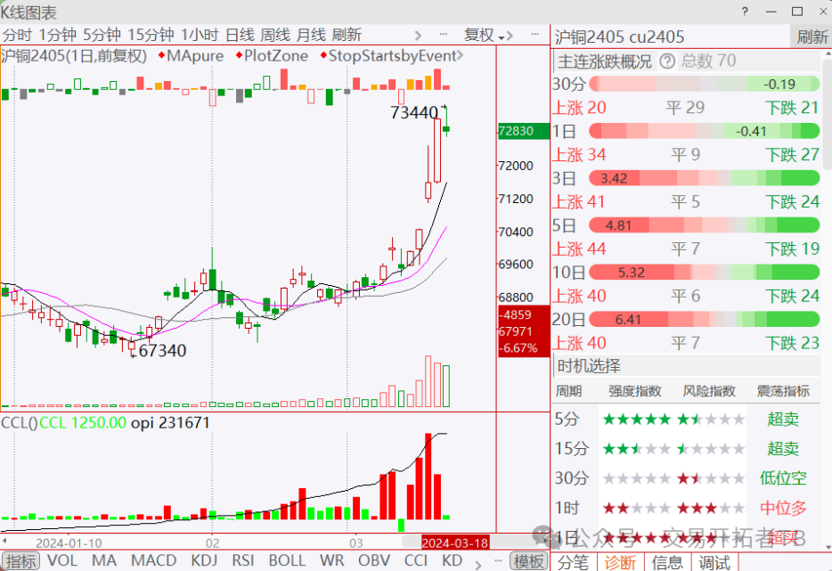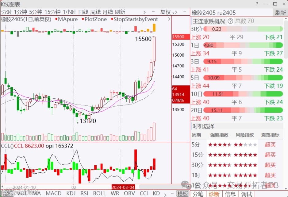 橡胶就像是昨天的沪铜, 增仓放量大阳线后应该是确定的走向;但各个周期时机选择上的风险指数处于较高的位置。那后续的走势应注意风险。
