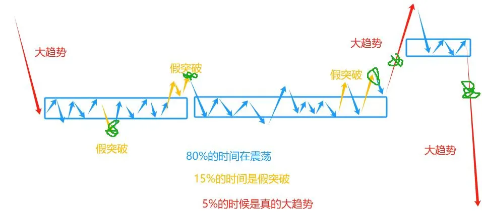 在交易的过程中,80%的时间都是在小幅震荡的,15%的时间都是“假突破”,只有5%的时间是真正在走趋势。因为有“假突破”的存在,做趋势并不是“买完等就行了”,这是很多新手的误区。