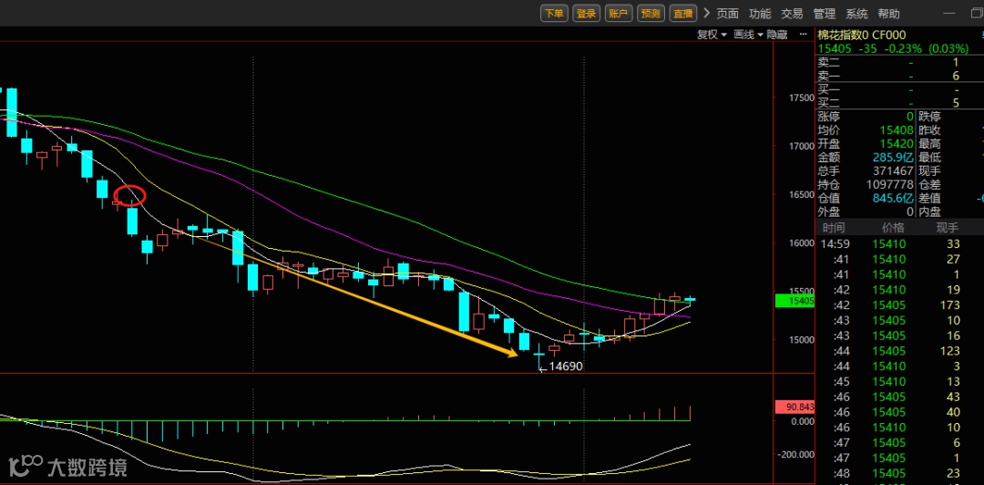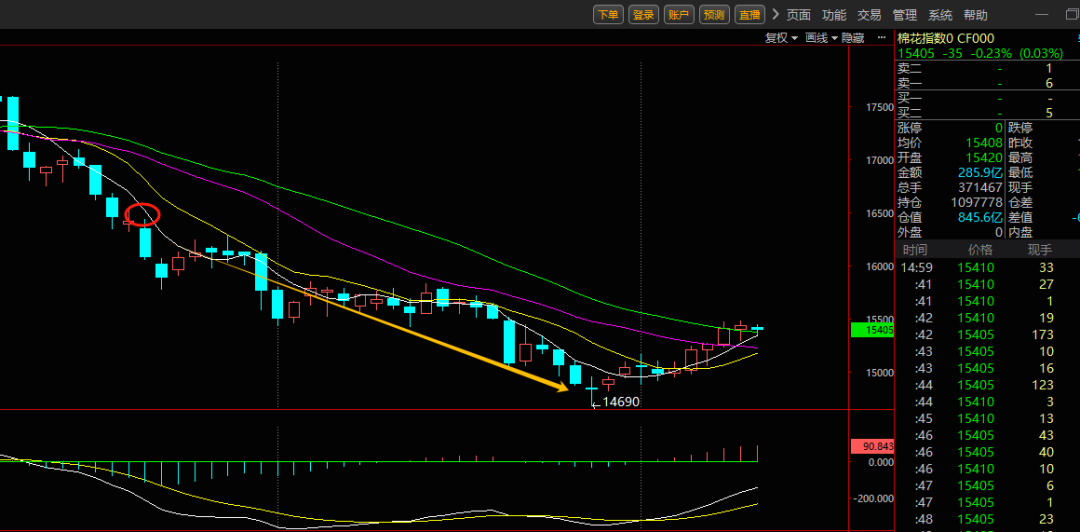 比如棉花这个行情,因为棉花的行情是我之前一直关注的,而且趋势强度指标及时给了信号,所以我就拿它来打比方。当初在16850的时候趋势强度指标已经出现空头信号,这时候做交易就可以来参考均线。