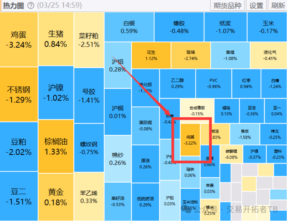 回看上面的品种概览, 你会发现纯碱增仓力度很大(颜色很黄),但成交力度指数还不太大
