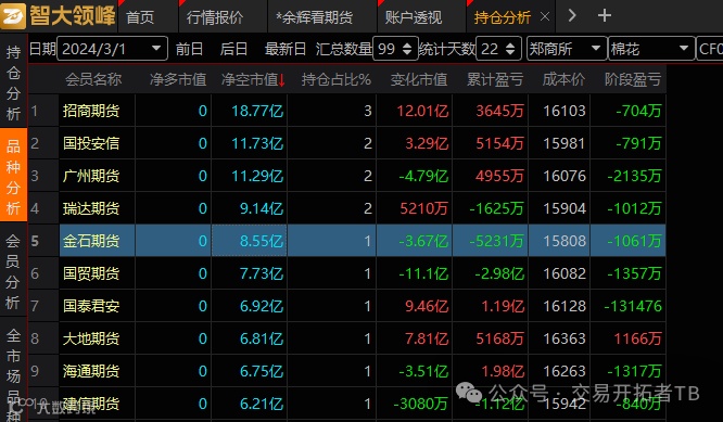物产中大,这席位应该是企业套保资金,上周套保资金在相对高位开始多翻空,目前净空单有2566手。套保的逻辑是,某些企业库存量太大,短期棉花价格较好的时候,在现货市场无法出清库存,就会选择期价较好的时候套保出清。