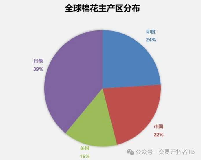 印度是全球最大的棉花生产国,中国是第二的棉花生产国和第一的棉花进口国、美国是第三的棉花生产国。产量占比如下: