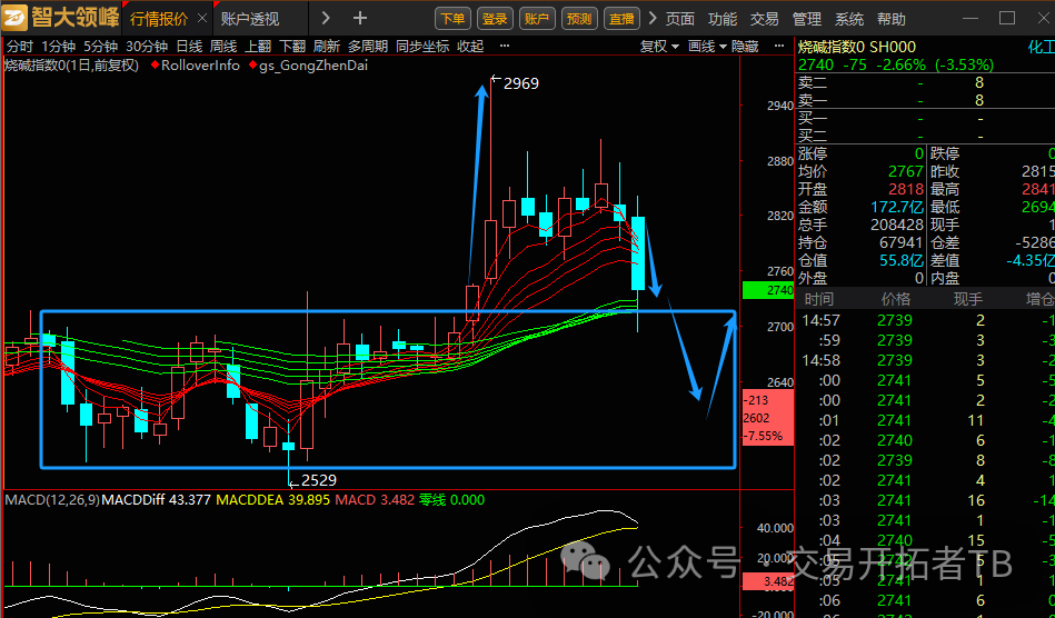 这个我用共振带指标来分析,烧碱原本在2600附近震荡,涨了2天最高涨到2972,之后连续多日在2800附近震荡。今天一根大阴线又跌回最初的震荡区间。目前共振带红线已经拐头向下,绿线处于一个收缩状态。这种情况来看,后面几天烧碱或将下探到下方震荡区间的低位2500附近。