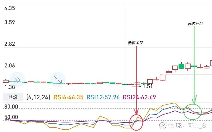 当RSI指标的6日线在50以上的高位区向下跌破长期RSI线