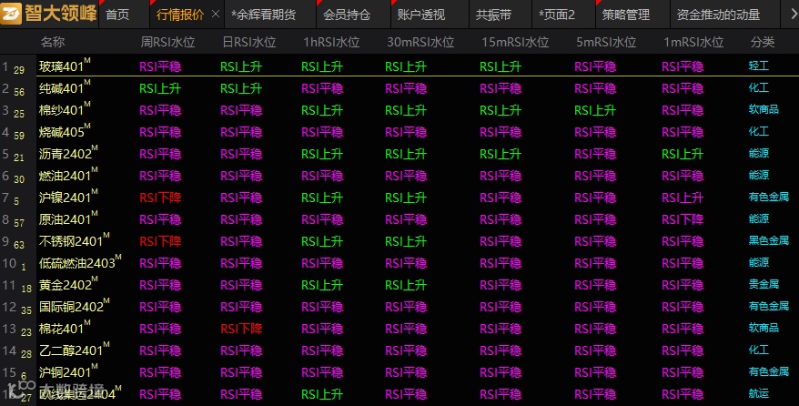 它应用起来是这样的,如下图,可以同时跟着多个品种多个周期RSI指标的变化。如果你很擅长使用RSI指标,那么我们把它量化可视化后,极大的节省了你的时间。