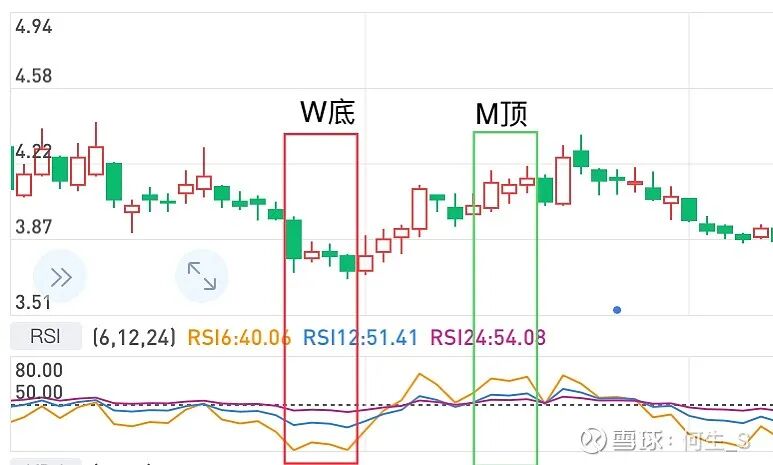 RSI曲线形成M顶或三重顶等高位反转形态时