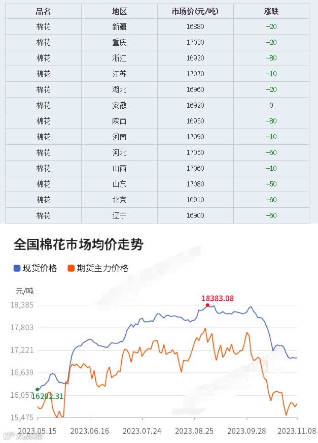 棉花期货近几天有小幅反弹,现货市场则没有反弹,今天棉花现货市场依旧在下跌。如下图: