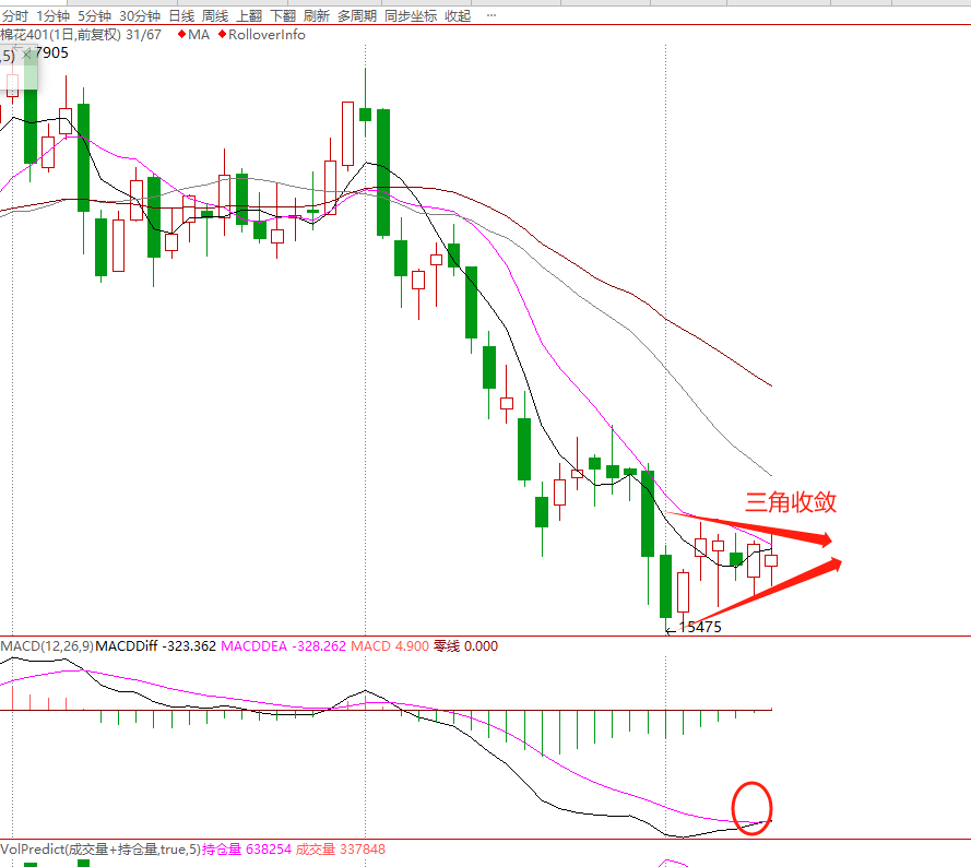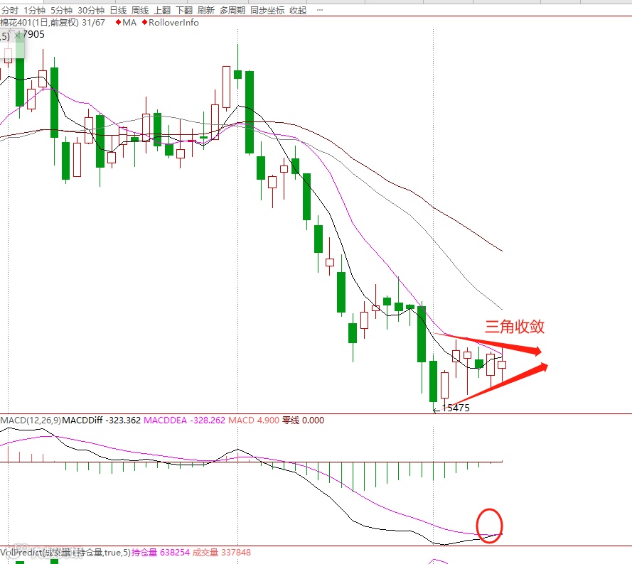 棉花技术面上大趋势还是空头,均线空头排列,但是短周期走了三角收敛的格局,近一两天方向就会明朗。macd指标是出现了要给超跌反弹的金叉,不过看MACD的朋友都知道这个指标有时候背离后还有背离。只能结合其它指标一起看,不能作为独立参考指标。