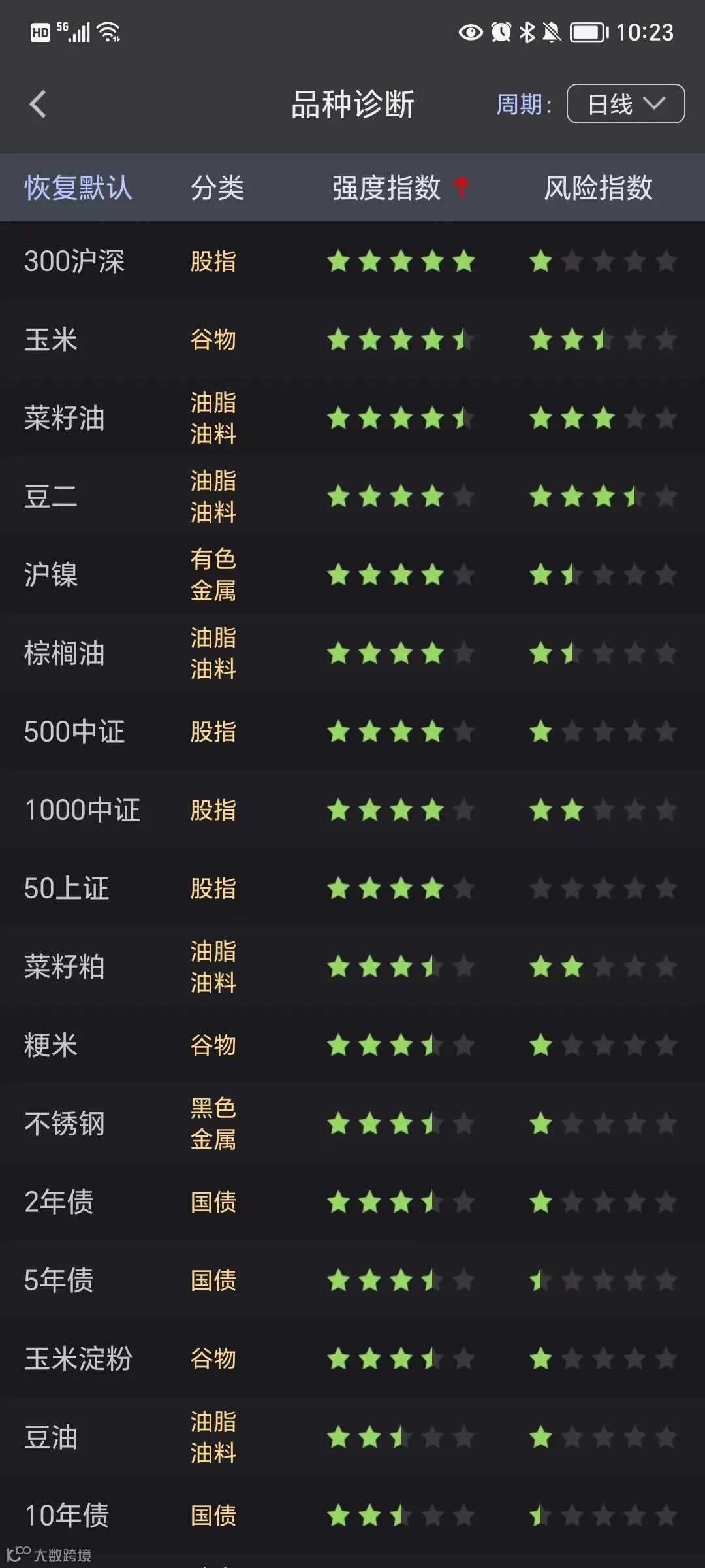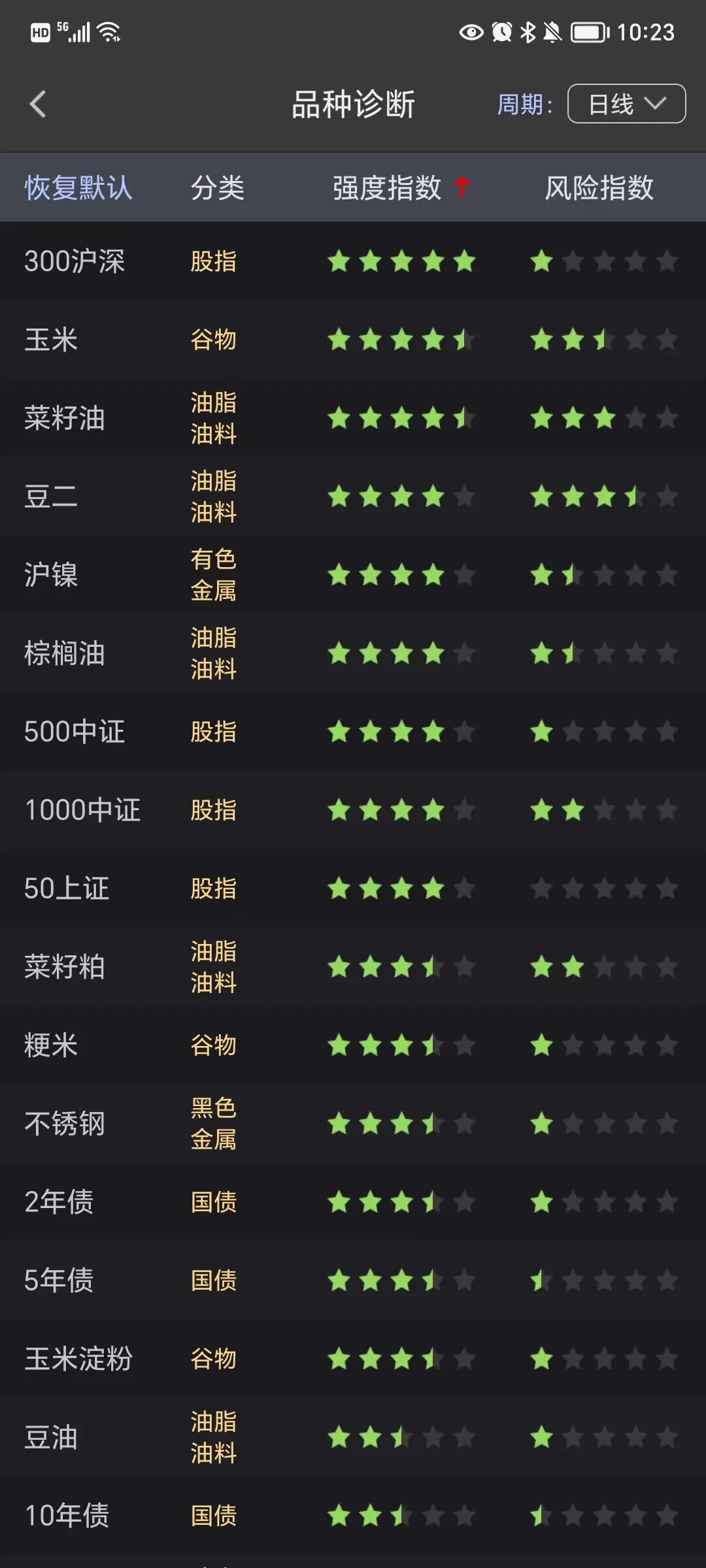 今天上午,品种诊断出的强度指数高且风险指数低的品种如下图: