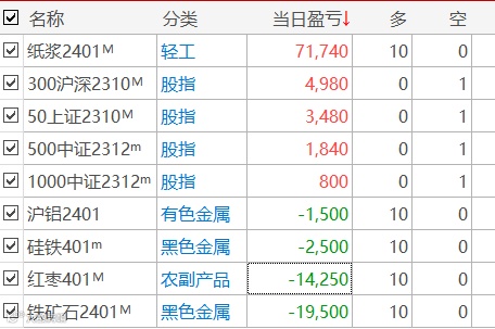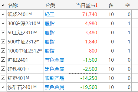 纸浆是本周一根据这个指标做的多单,开始是买了300手,今天把它降到10手。其他的尽量买10手,黄金和股指太贵了,黄金指标上也还是强势的多头,但是太贵了,盘中我就出掉了。股指每个都做一手。截至到收盘,结果如下图: