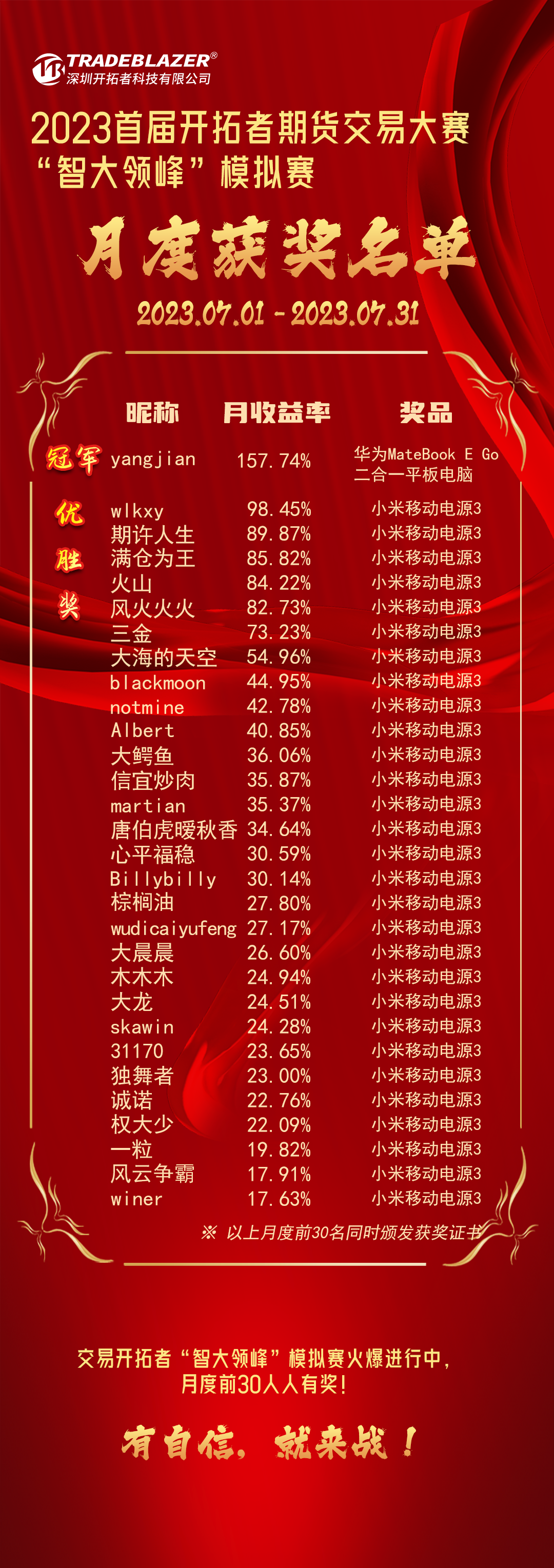 2023首届开拓者期货交易大赛 “智大领峰”模拟赛7月榜单角逐现已落下帷幕!恭喜选手“yangjian”以157.74%月收益率拿下本月冠军!