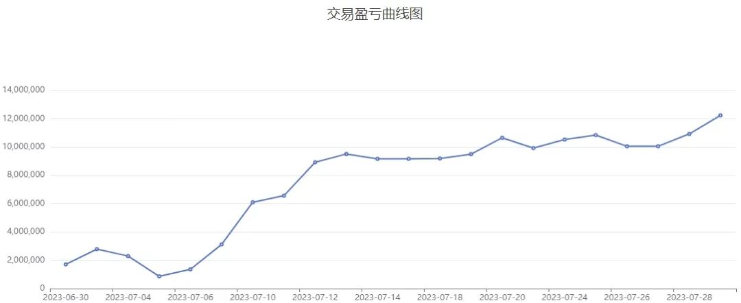 从收益盈亏图看,“wlkxy”选手本月上半段稳扎稳打,收益呈现快速上升趋势;可惜之后遭遇一波回撤,及时调整之后奋起直追,月末时净值再创新高,也是取得了近乎翻倍的收益。