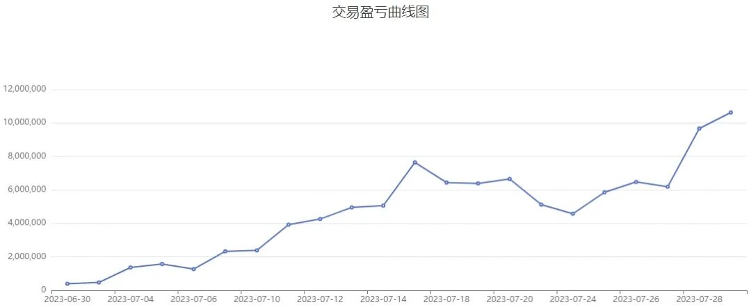 从收益盈亏图看,“wlkxy”选手本月上半段稳扎稳打,收益呈现快速上升趋势;可惜之后遭遇一波回撤,及时调整之后奋起直追,月末时净值再创新高,也是取得了近乎翻倍的收益。