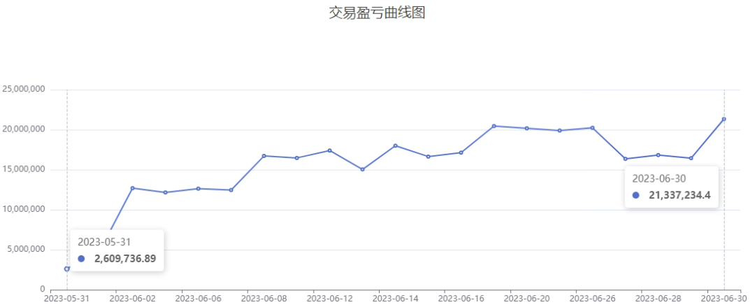 从盈亏曲线图可看到, 选手“下雨了”本月收益可谓一步一登天。从5月末的260万盈利一直增长到月底的2100多万,期间每个盈利的台阶都上得很稳。