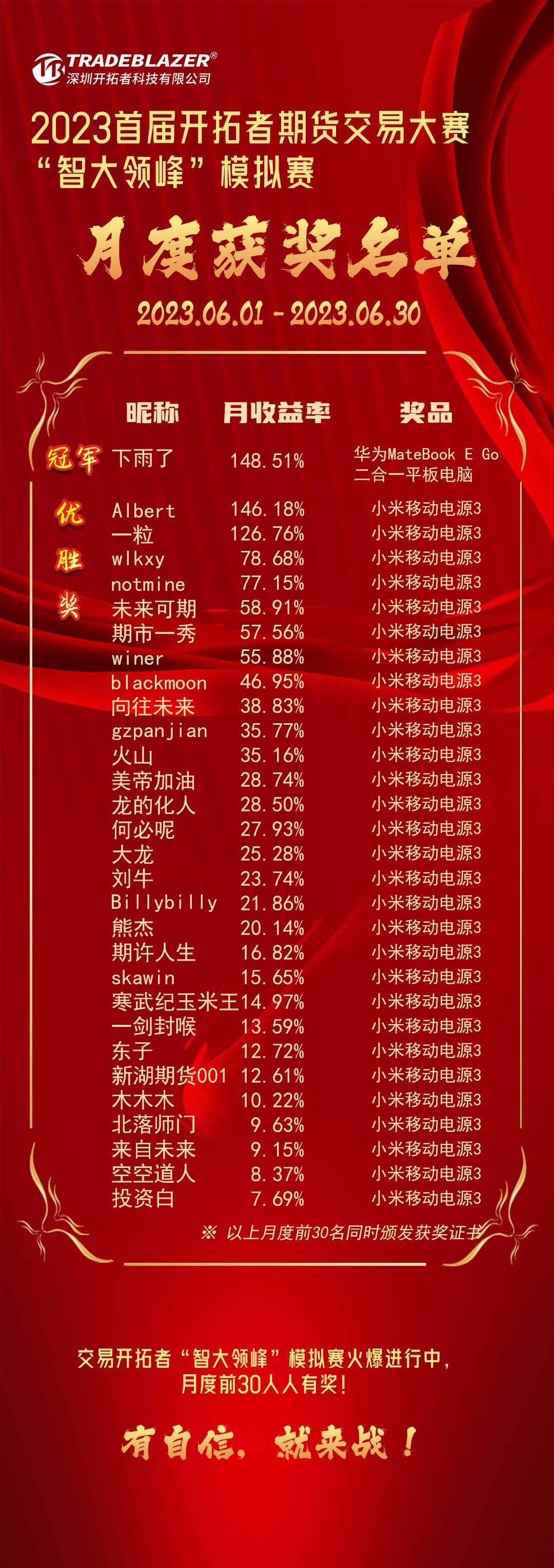 2023首届开拓者期货交易大赛 “智大领峰”模拟赛6月榜单现已结束角逐!恭喜选手“下雨了”以148.51%月收益率拿下本月冠军!